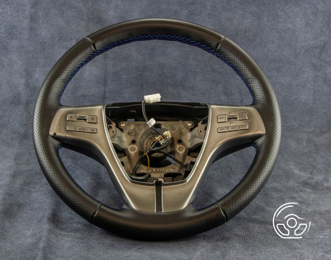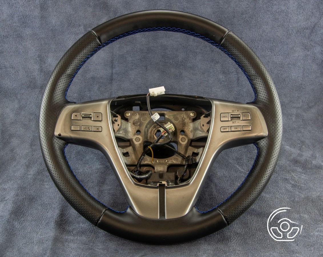 Mazda 6GH Mazda 6 GH przedlift (2007 - 2012) Połączenia skóry gładkiej typu NAPPA i perforowanej. Szycie niebieską nitką.