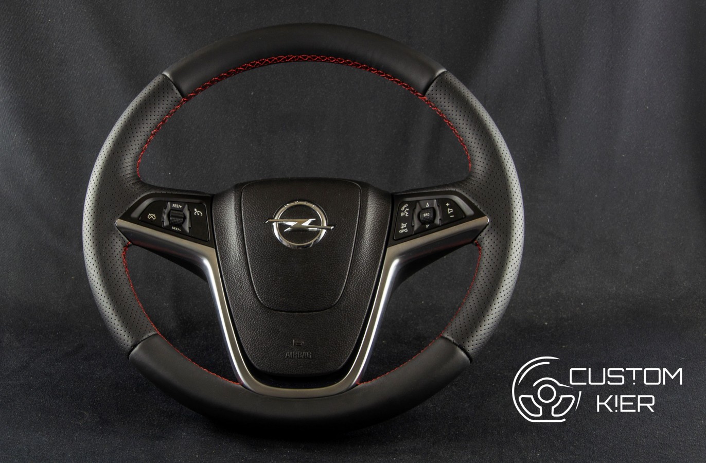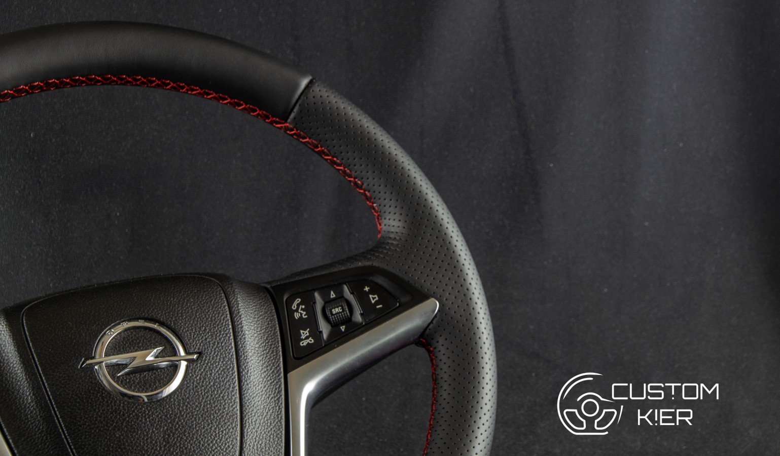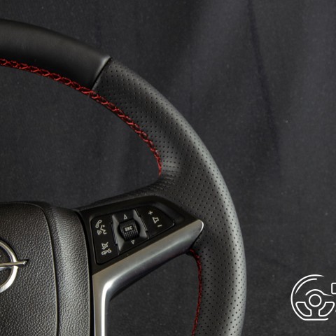 Połączenie skóry gładkiej i perforowanej z czerwoną nitką.